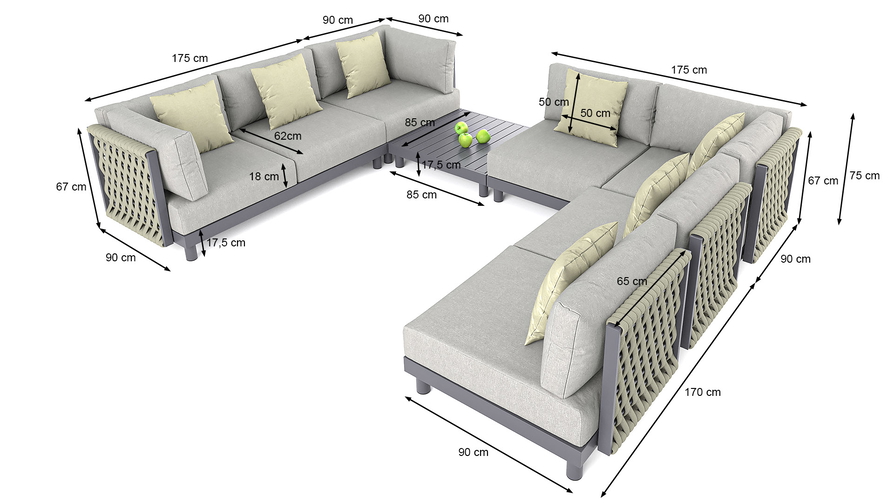Farbe (LZ1) anthrazit Abdeckplane (optional erhältlich) Schutz vor Schmutz und intensiver UV-Strahlung2, im Shop erhältlich, 190x95x65 cm Kissen & Auflagen wie abgebildet, hoher Sitzkomfort2, dicke Rückenpolster, Kunstfaser, 18 cm dicke Sitzauflagen, Schaumstoff, 24 cm dicke Rückenauflagen, Kunstfaser Material Aluminium Montage Montage der Rückenlehnen erforderlich, Montage der Armlehnen erforderlich Lieferumfang inkl. Verbindungsklammern, 1x Mittelsofa, inkl. Dekokissen Sitzplätze bis zu 2 Obermaterial schnell trocknend, Farbe: graubraun, PVC-Mantel inkl. Gummi-Kern, Rücken- und Armlehne: 38 mm breites Rope Gestell Aluminium, pulverbeschichtet, robust, rostfrei, wetterbeständig Bezug steingrau, 100% Polyester, abnehmbar, waschbar bei 30°C, robuste Verarbeitung, hohe Festigkeit, verdeckte Reißverschlüsse, durchgefärbt2, vorimprägniert2 Eigenschaften Traglast bis zu 120 kg pro Sitzplatz, wetterbeständig, Sofaelemente frei positionierbar, Arm- und Rückenlehne mit Rope, Arm- und Rückenlehne abnehmbar SKU 910912826 Veiligheidsinstructies