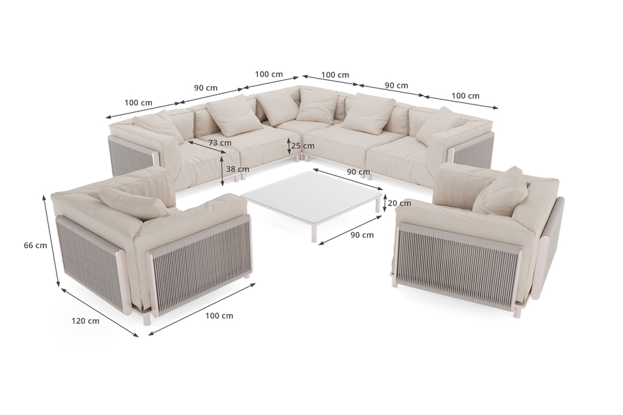 Abdeckplane (optional erhältlich) 300D starkes Polyester, Innenseite PVC beschichtet, doppelte Naht, robuste Verarbeitung, Lichtechtheit 4, sehr gut Kissen & Auflagen hoher Sitzkomfort, Dekokissen, Kunstfaserfüllung, 25 cm dicke Sitzauflagen, Schaumstoff Material Aluminium, Champagne, Rope Montage Montage nicht erforderlich Tischplatte Klarglas, ESG-Sicherheitsglas, Stärke 5 mm Lieferumfang 2x Mittelsofa, 1x Ecksofa, 2x Sessel, 2x Ecksofa, 1x Loungetisch, Sitzauflagen inklusive Sitzplätze bis zu 7 Obermaterial einfarbig, durchgefärbt Gestell robust, rostfrei, wetterbeständig Bezug YBSJ202309_100% Polyester, Beige , abnehmbar, waschbar bei 30°C, robuste Verarbeitung, edle Kedernaht, Zopfmuster Naht, hohe Festigkeit, hochwertige Kunstfaser, vorimprägniert, verdeckte Reißverschlüsse Eigenschaften Traglast bis zu 120 kg pro Sitzplatz, wetterbeständig, pflegeleicht, Gestell mit Rope Bespannung SKU 37909 Veiligheidsinstructies